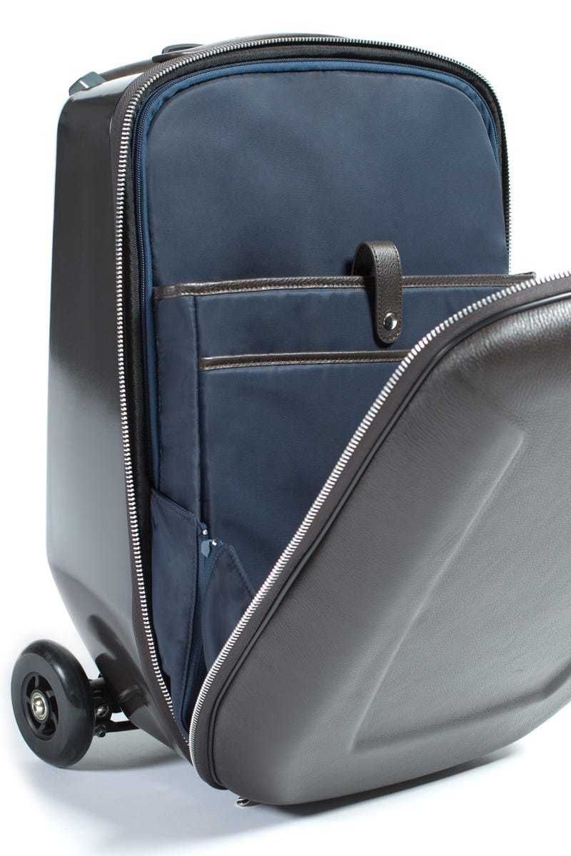Micro Suitsipply представляет собой: чемодан и самокат. Чемодан выполнен из итальянской кожи высокого качества, что делает его таким элегантным и привлекательным.В комплекте идут - чехол для хранения и прокладки поворотного механизма: черные средней жесткости - стандартные, красные более жесткие - для людей с весом выше среднего и синие мягкие - для людей с весом ниже среднего. Так же в комплект входят три небольшие и удобные кейса на молнии для мелочей, которые могут пригодиться во время путешествия.