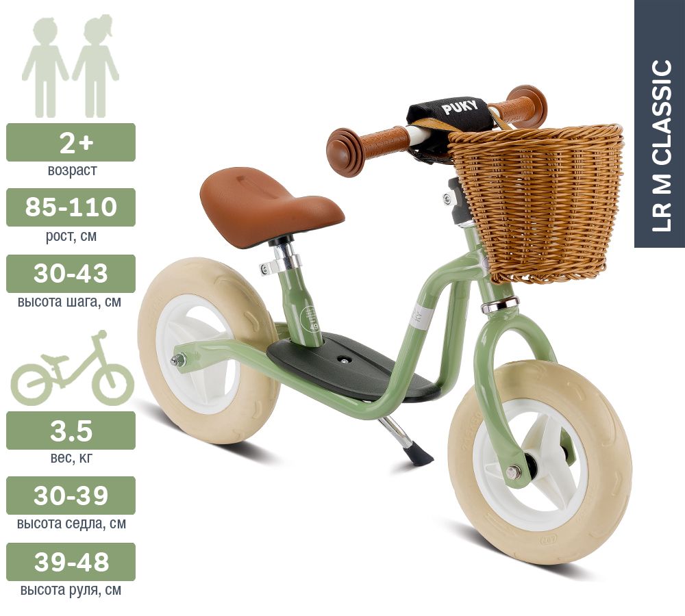 Беговел Puky LR M Classic – обновление в винтажном дизайне самого популярного первого беговела Puky LR M. Миниатюрный, компактный и эргономичный беговел для малышей теперь с плетеной корзиной для игрушек и подставкой для парковки. Подойдет для детей с 1,10 – 2 до 4 лет.