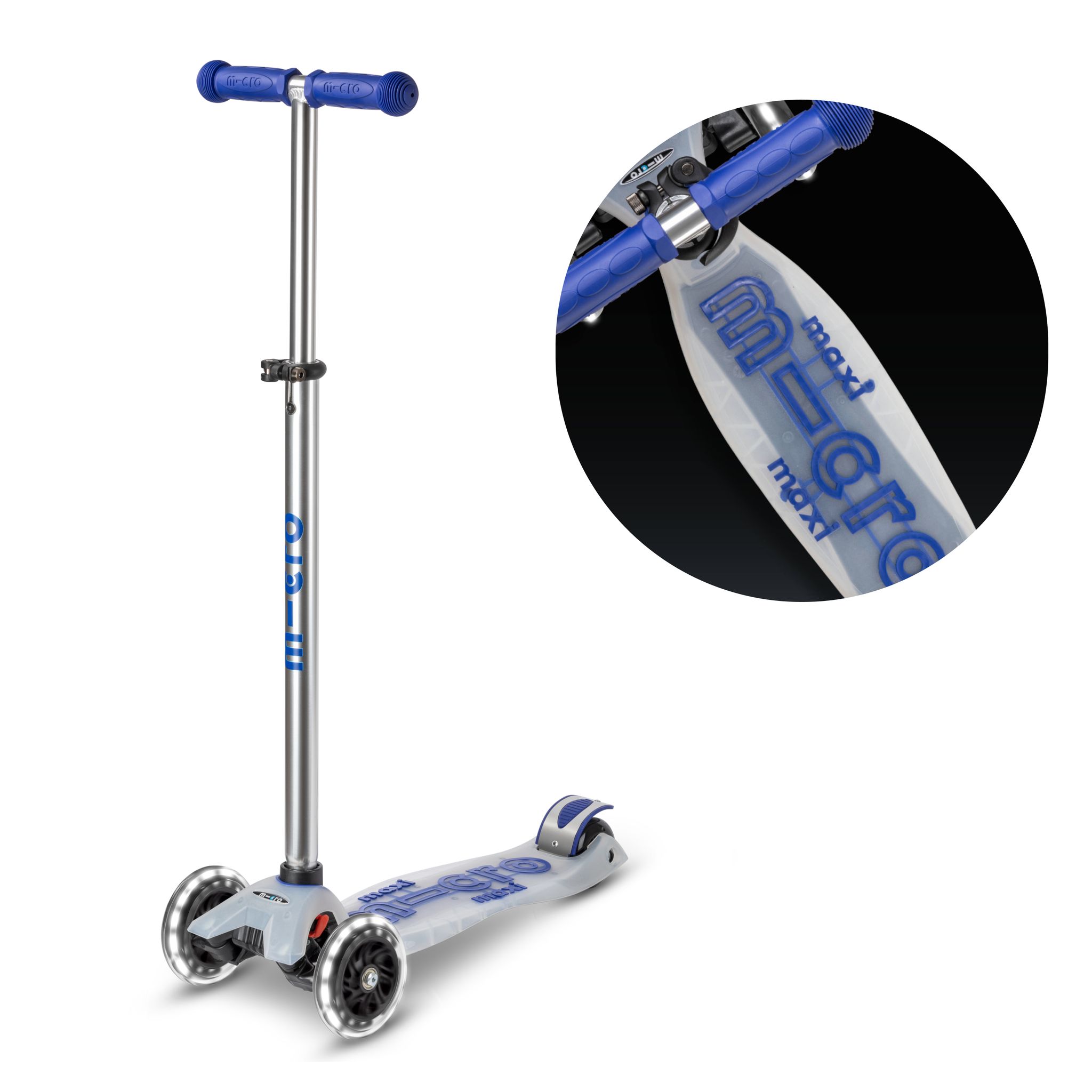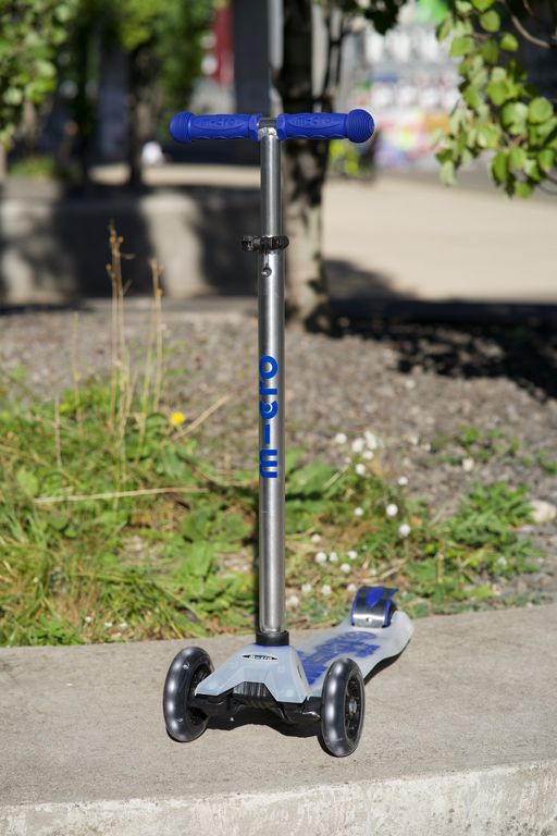Maxi Micro Deluxe Flux LED в синем цвете - это усовершенствованная модель популярного детского самоката, выполненная в ярком и привлекательном дизайне. Он идеально подходит для детей в возрасте от 4 до 12 лет. Основные особенности включают светящиеся колеса, которые обеспечивают дополнительную безопасность в пасмурные дни и темное время суток. Самокат оснащен регулируемой высотой руля от 67 до 91 см, усиленной платформой, способной выдерживать нагрузку до 50 кг, и сильным надежным тормозом. Максимальная нагрузка на платформу позволяет использовать самокат долгие годы.