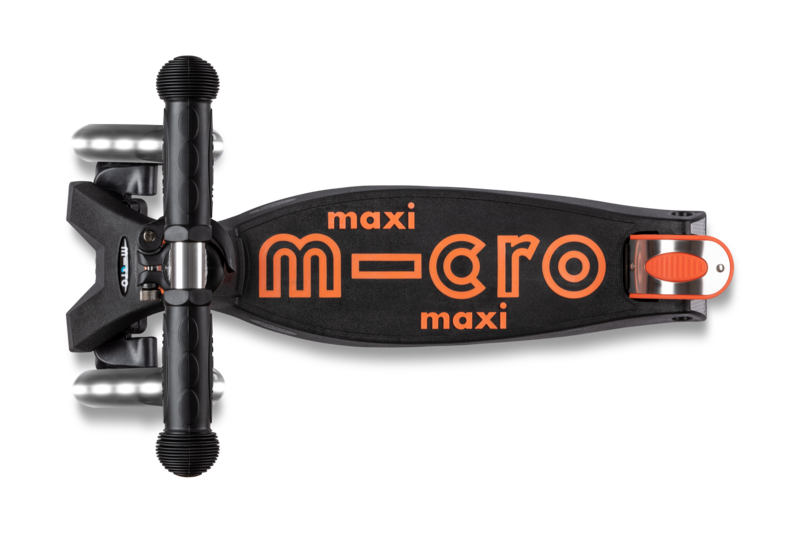 Maxi Micro Deluxe в черно-оранжевом цвете с LED светящимися колесами - это усовершенствованная модель популярного детского самоката, выполненная в ярком и привлекательном дизайне. Он идеально подходит для детей в возрасте от 4 до 12 лет. Основные особенности включают светящиеся колеса, которые обеспечивают дополнительную безопасность в пасмурные дни и темное время суток. Самокат оснащен регулируемой высотой руля от 67 до 91 см, сдвоенным задним колесом для лучшей устойчивости и сильным надежным тормозом. Максимальная нагрузка на платформу составляет до 50 кг, что позволяет использовать самокат долгие годы.