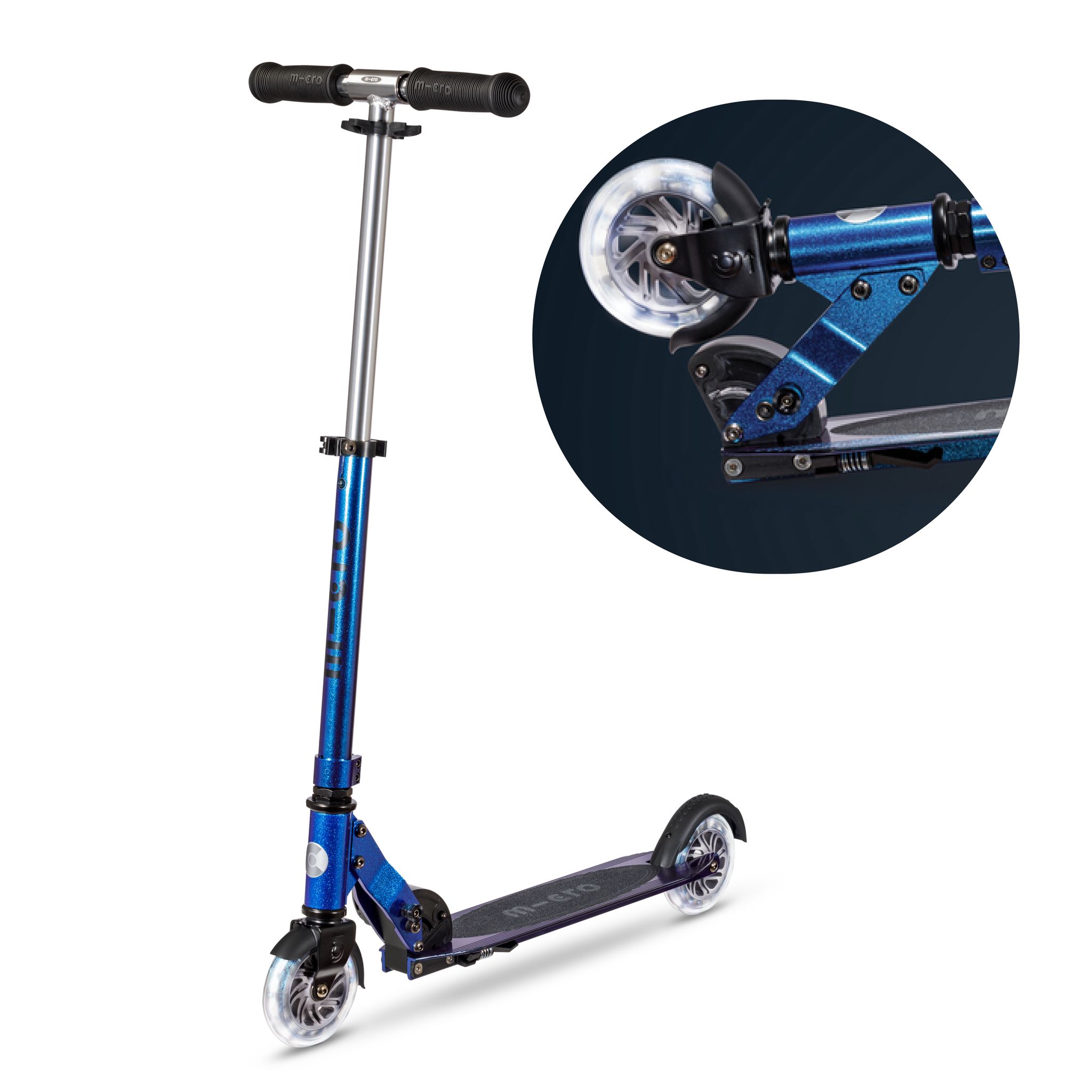 Особенности: LED светящиеся колеса, компактный складной механизм, короткий деку и низкий руль для удобства детей