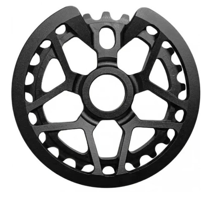 Эта алюминиевая звезда от TechTeam весит всего 104 грамма и имеет 25 зубьев. Толщина звезды составляет 6 мм, а центральное отверстие рассчитано на вал 24 мм (переходники не включены). Гард обеспечивает дополнительную защиту от ударов и повреждений. Подходит для BMX цепей шириной 1/8", но несовместим с узкими цепями 3/32".