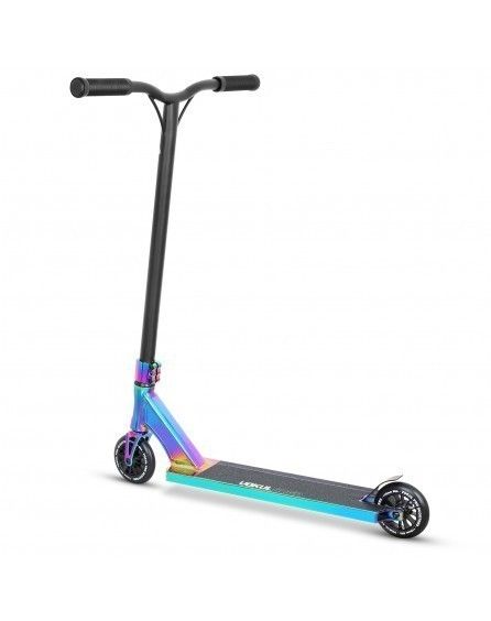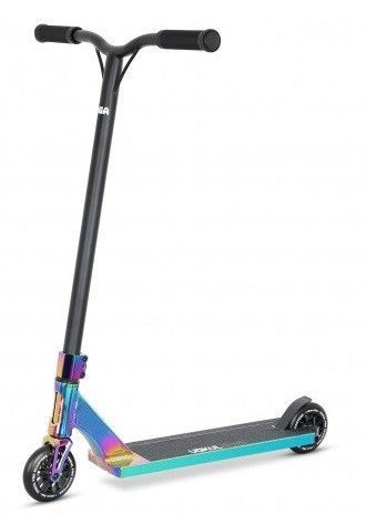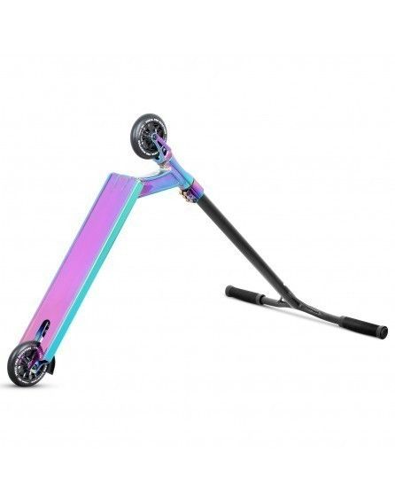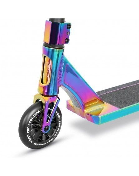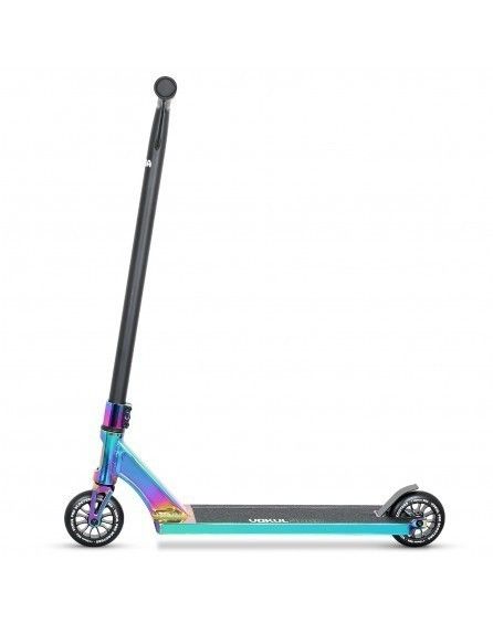 Трюковой самокат VOKUL SAGA NEO - отличный стильный самокат с трендовыми высоким рулем и широкими колесами. Модель имеет Y-образный хромомолибденовый руль с HIC компрессией высотой 625 мм и шириной 540 мм, алюминиевую деку длиной 500 мм и шириной 115 мм с прямым конкейвом, стандартным углом наклона, рейлами на дне и скошенными дропами, а так же полиуретановые колеса 110 мм средней жесткости шириной 26 мм с подшипниками класса ABEC-9. Самокат достаточно легкий, прочный и очень удобный для выполнения любых трюков! Рассчитан на рост от 145 см.